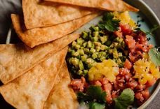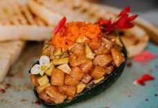 180/40 г • Маринованный тунец, авокадо, джем из манго, посыпается кунжутом и кинзой. Подается с тортильей.