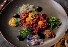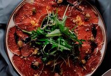 180/40 г • Маринованная говядина, красный лук, корнишоны, каперсы, желток, рукола. Подается с запеченными тостами из чиабатта.