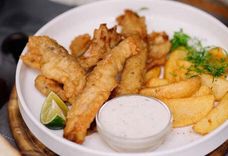200/40 г • Филе трески в кляре, подается с картофельными дольками и соусом тар-тар.