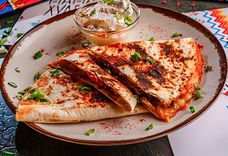 250/40 г • Тортилья с обжаренным куриным филе овощами, миксом сыра и салатом айсберг. Подается с копченой сметаной.